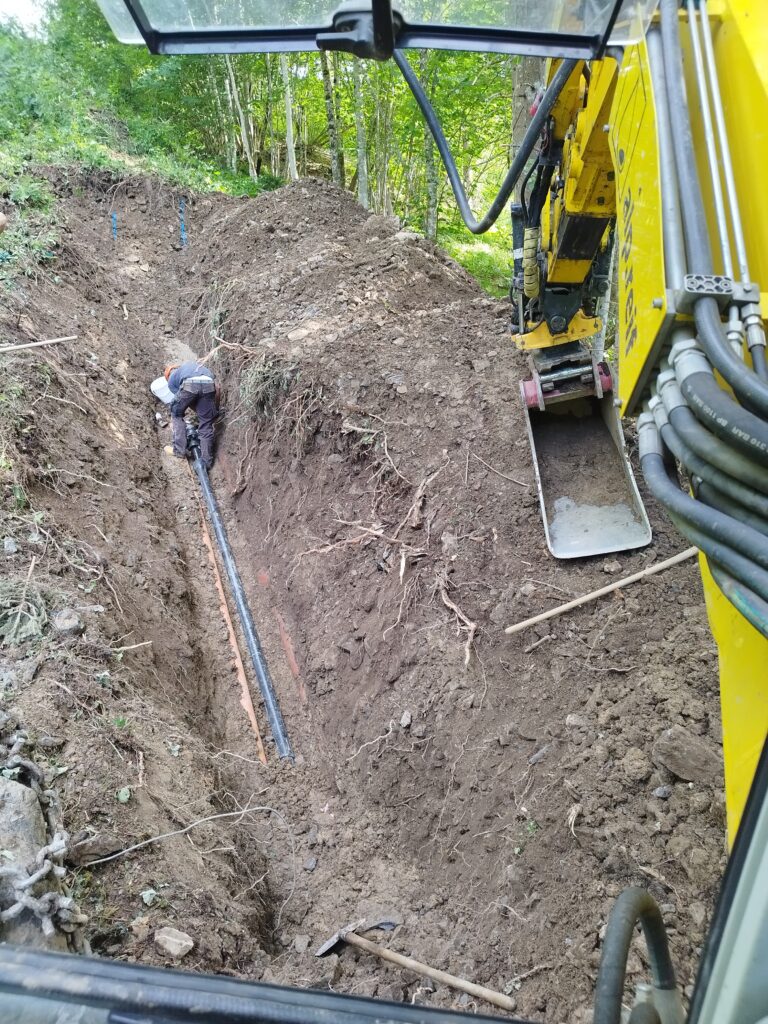Ausheben und verfüllen von Gräben für den Leitungsbau in unwegsamen, schwer zugänglichen oder steilen Gelände ist mit unserem Menzi Muck 4x4 Schreitbagger kein Problem. Durch die 4 angetriebenen Räder können auch längere Zufahrtswege problemlos zurückgelegt werden.